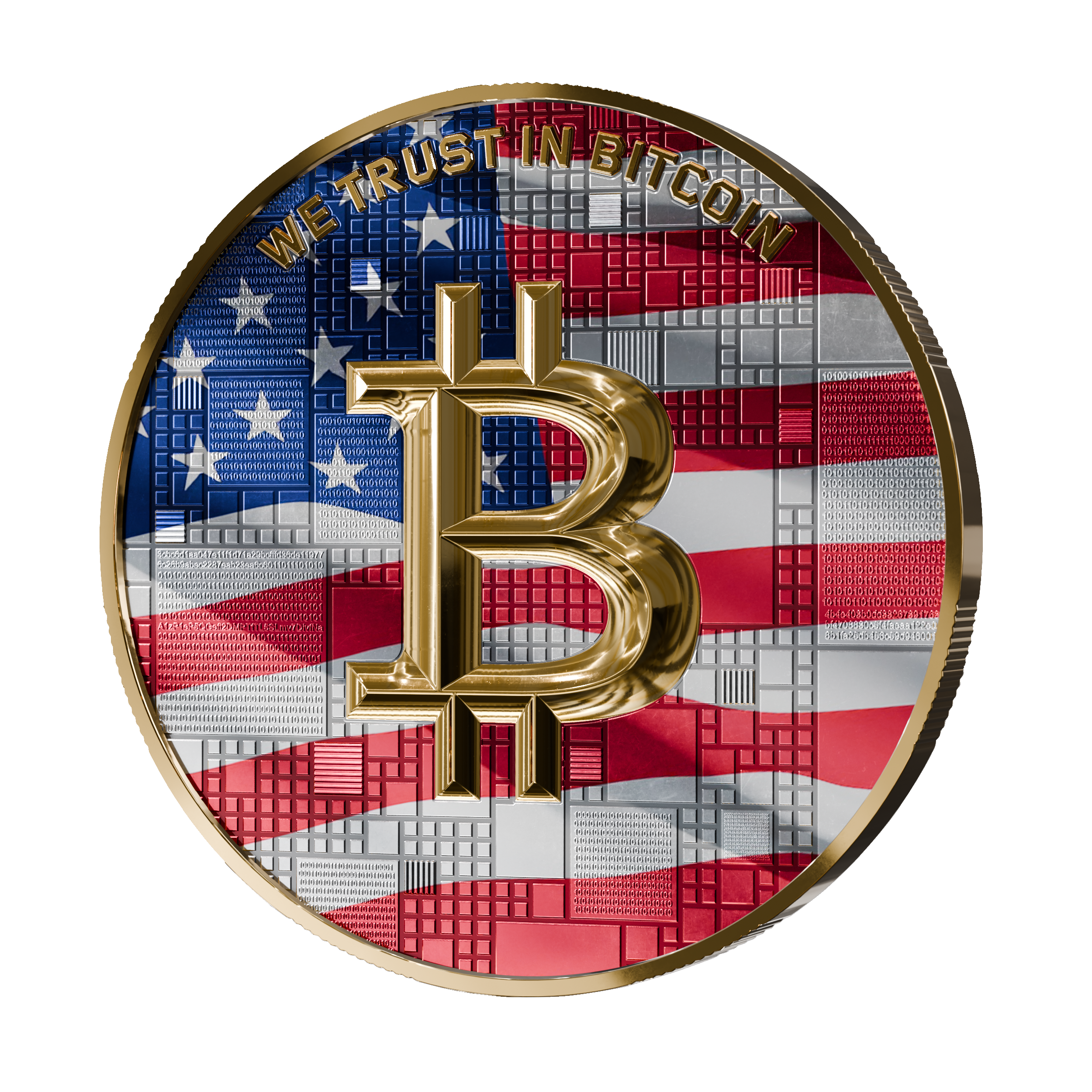 On the obverse, the iconic Bitcoin symbol is prominently featured, framed by a detailed representation of blockchain technology. The inscription “We trust in Bitcoin” reinforces confidence in the decentralized currency and reflects the global potential of this digital revolution.