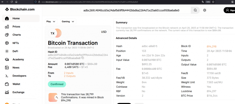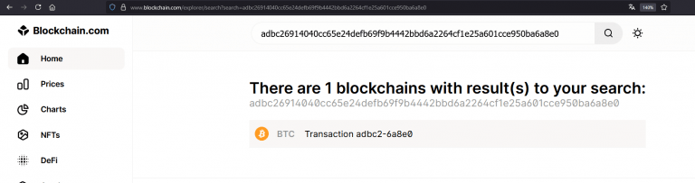 Here a search on www.blockchain.com as an example, with the transaction hash “adbc26914040cc65e24defb69f9b4442bbd6a2264cf1e25a601cce950ba6a8e0”